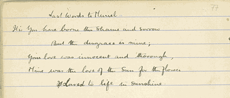 An amended version, 'Last words to Miriam', was published first in Amores (1916) and in the Poetry Journal (Dec. 1916). Further changes were made in the version published in Collected Poems (1928).