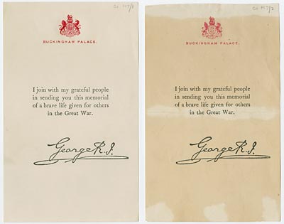 Identical documents, one attacked by acids from a former backing board (Co M 7/1-2)