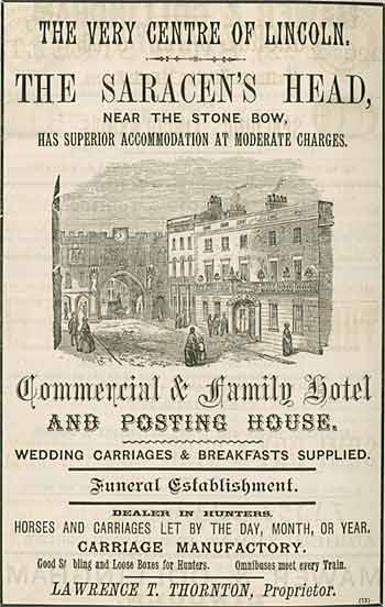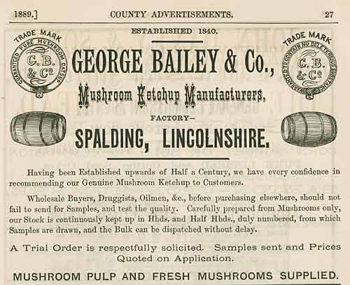 Most local advertising cards are undated, but trade directories can supply details about the businesses. By the later 19th century, directories themselves carried advertisements, often richly illustrated. These examples, of a hotel in Lincoln and a mushroom ketchup manufacturer in Spalding, come from Kelly's Lincolnshire and Hull Directory, 1889.