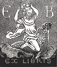 The image used as a bookplate by Eiríkur Benedikz illustrates the legend of Saemundur Sigfusson 'The Wise', a 12th-century Icelandic cleric and historian, who was allegedly transported with his psalter to Oddi by the devil in the shape of a seal.