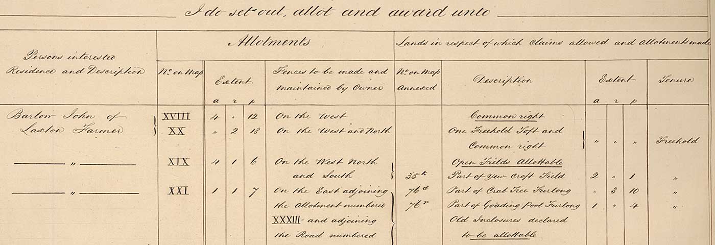 This detail shows some of the pieces of land allotted to John Barlow, shown in Roman numerals on the map. He was allotted three in respect of the strips he had held in the open fields, and two in compensation for his common right (his right to graze his livestock on the common, which was now enclosed). His “old inclosures” were unaffected by the process. He had to fence his new allotments, at his own expense.