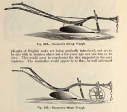 This popular compendium on farming went into numerous editions. Shown here are pages relating to ploughs and furrows. Both swing and wheel ploughs were used in Laxton in the late nineteenth century. The coulter at the front of the plough cuts through the upper layer of the soil, and the curved mouldboard pushes it over to the right so that it lies half on top of the previously ploughed furrow. New soil is exposed and weeds are buried.