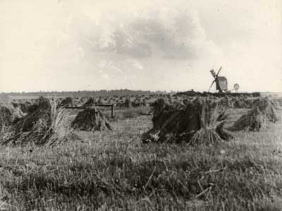 Laxton’s windmill, situated in Mill Field, is shown on Mark Pierce’s 1635 map. It was blown down in 1916 and not replaced. The photograph was taken at harvest time. Sheaves of the harvested cereal are arranged into ‘stooks’ to dry for a few days before being taken to be threshed.