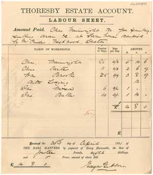 Pre-printed Thoresby Estate labour sheet for workmen’s wages at Westwood Farm, 1881