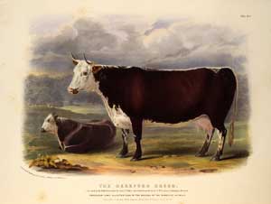 Illustration of a Hereford cow and calf, from David Low, The breeds of the domestic animals of the British Islands