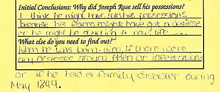 Year 8 students produced these worksheets during classroom sessions in which they analysed documentary material relating to Laxton. They looked in detail at a sale notice of Joseph Rose’s possessions and an 1862 survey describing his farm (both of which are in the Laxton website) and also at an entry in the 1862 survey relating to Sarah Rose’s cottage and small garden. A photograph, displayed in Case 2 of this exhibition, can now reveal what her cottage actually looked like. The students also explored the workings of the Laxton Court Leet.