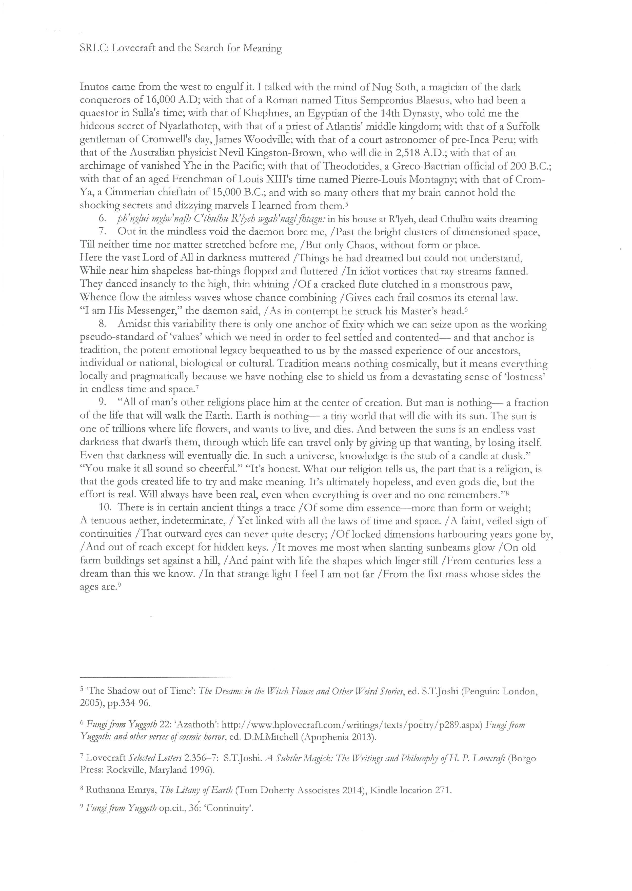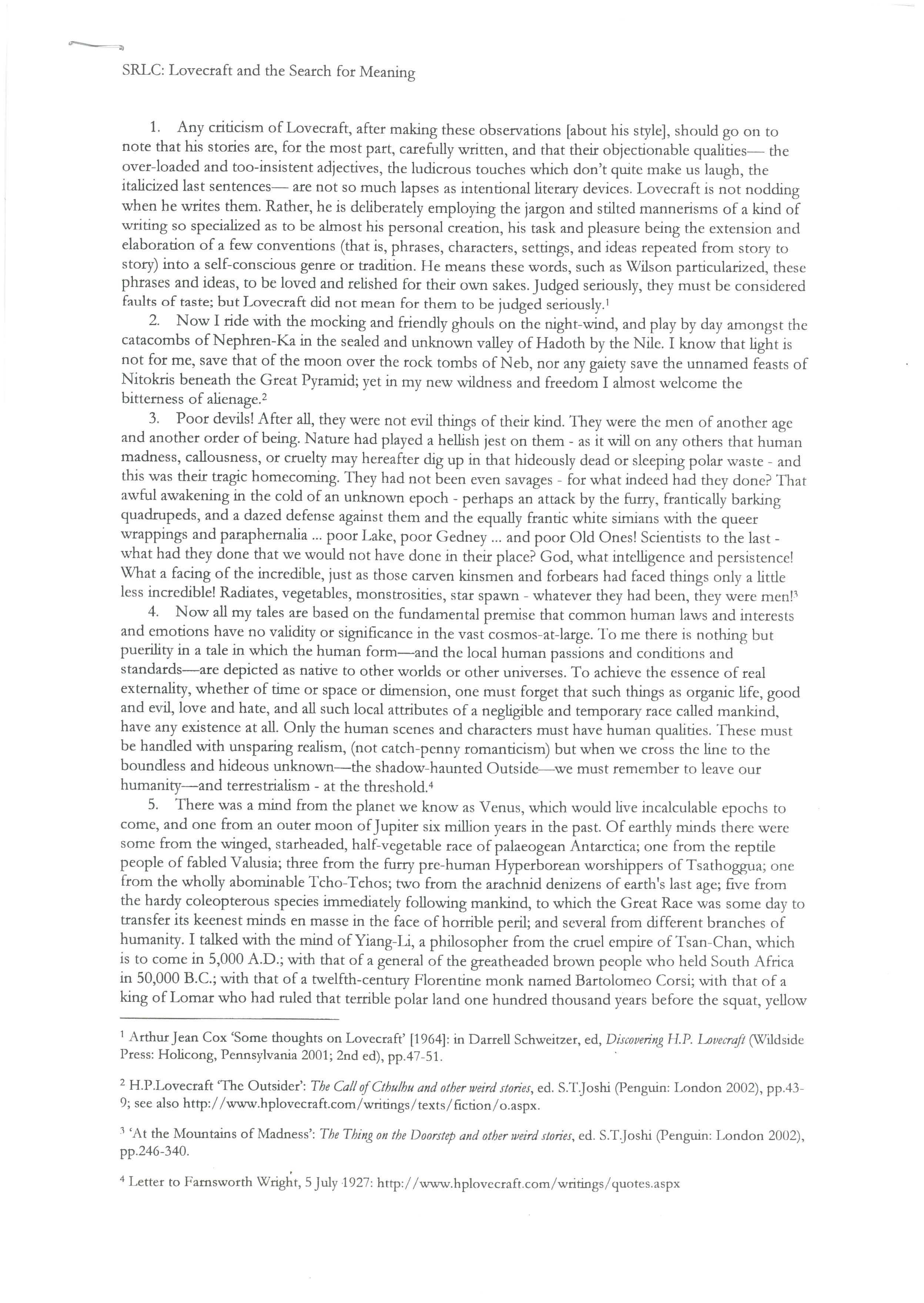 Professor Stephen R. L. Clark: Lovecraft and the Search for Meaning. The notes referred to are available: page 1, page 2.