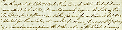 With respect to Nottm Park I beg leave to state that if it was now offered to be Sold, it would greatly injure the Sale of the Building Land and Houses in Nottingham...