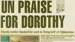 Press cutting about a Jacob's Well charity worker who was making her fifth visit to Afghanistan, to deliver emergency supplies (Private collection)
