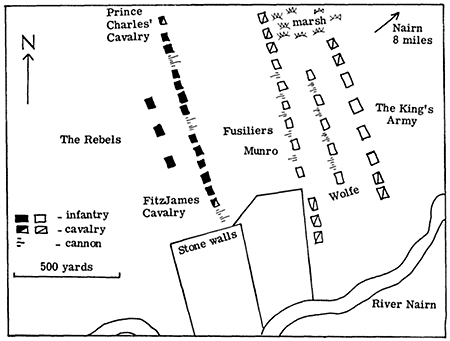 The rebel army formed a line of thirteen groups, each of which was made up from a clan. In the centre of the line were four cannon, and four cannon were placed on each wing. On the far right of the rebel's line were FitzJames' cavalry and about four hundred French troops. On the left were another four hundred troops and Prince Charles' cavalry. Behind the army were three columns of troops as a reserve: one on the left, one in the centre, and one on the right.