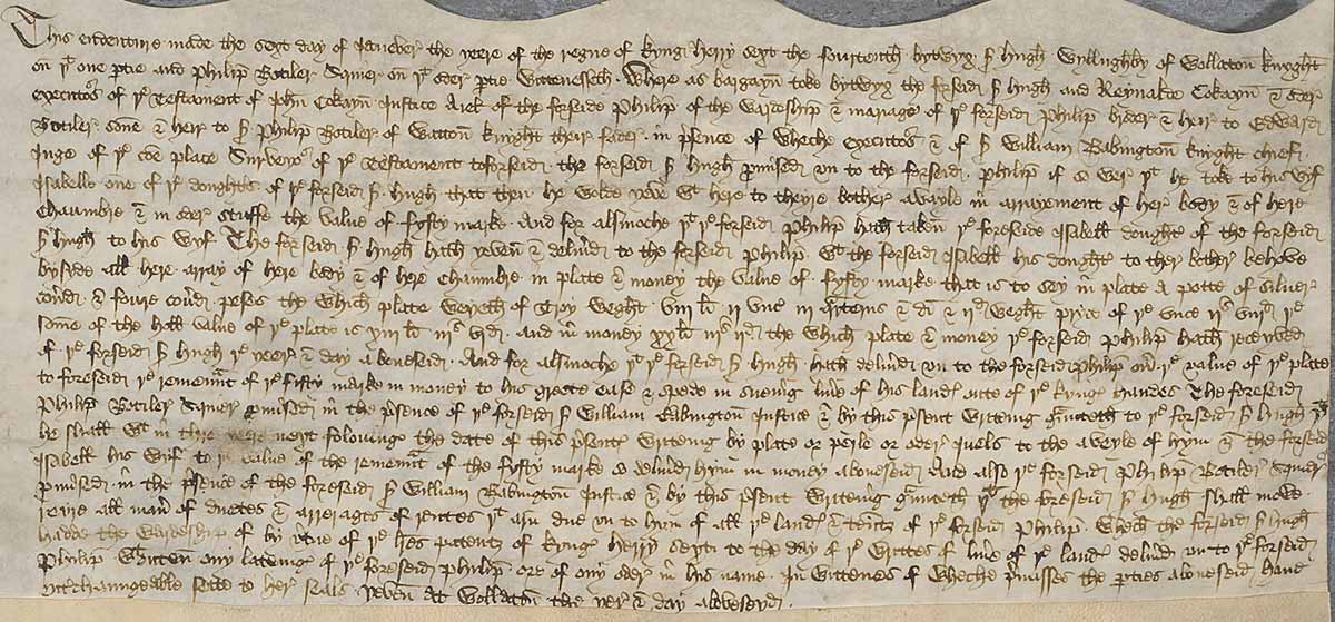 This endenture made the sext day of Janever the yeere of the regne of Kyng Herry sext the fourtenth bytwyx Sir Hugh Wyllughby of Wollaton knyght on þat one partie and Philip Botiler Squier on þat oder partie Wittenesseth.Where as bargayn toke bytwyx the forseid Sir Hugh and Reynalde Cokayn and oder executours of þe Testament of John Cokayn Iustice A relative of the forseide Philip of the Wardeship and mariage of þe forseid Philip broder and heir to Edward Botiler . sonne and heir to Sir Philip Botiler of Watton knyght their fader . in presence of wheche executours and of Sir William Babington knyght chief Iuge of þe commone place Surveyour of þe Testament toforseid . the forseid Sir Hugh promised vn to the forseid Philip if so wer þat he toke to his wyf Isabelle one of þe doughters of þe forseid Sir Hugh that then he wolde yeve with here to theyre bother avayle in arrayement of her body and of here Chaumbre and in oder stuffe the value of fyfty marke. And for alsmoche þat þe forseid Philip hath taken þe foreseide Isabell doughter of the forseid Sir Hugh to his wyf The forseid Sir Hugh hath yeven and deliuerd to the forseid Philip with the forseid Isabell his doughter to ther bother behove bysyde alle here array of here body and of here Chaumbre in plate and money the value of fyfty marke that is to sey in plate a potte of siluer couerd and foure couerd peses the which plate weyeth of Troy weght viij pounds ij unces iij quarterns and a half and ii pence weght pryce of þe vnce ij shillings viij pence þe somme of the holl value of þe plate is xiij pounds iij shillings vj pence. And in money xx pounds iij shillings ij pence. the which plate and money þe forseid Philip hath receyved of þe forseid Sir Hugh þe yeer and day a boueseid. And for alsmoche þat þe forseid Sir Hugh hath deliuerd vn to the forseid Philip ouer þe value of þe plate to foreseid þeremenaunt of þe fifty marke in money to his greete ease and spede in sueing liuere of his landes oute of þekynges handes The foreseid Philip Botiler Squier promised in the presence of þe forseid Sir William Babington Iustice and by this present writeing graunteth to þe forseid Sir Hugh þat he shall with in thre yeers next folouing the date of this presentes writeng by plate or perle or oder Iuels to the aveyle of hym and the forseid Isabell his wyf to þe value of the remenaunt of the fyfty marke so deliuerd hym in money aboueseid And also þe forseid Philip Botiler Squier promised in the presence of the foreseid Sir William Babington Iustice and by this present writeing graunteth þat the foreseid Sir Hugh shall mowe reyre all maner of duetes and arrerages of rentes þat aren due vn to hym of alle þelandes and tenementz of þe forseid Philip Whech the forseid Sir Hugh hadde the Wardeship of by virtue of þe letres patentz of kyng Herry sexti to the day of þe Writtes of liuere of þelandes deliuered vn to þe forseid Philip withouten any lateing of þe foreseid Philip ore of any oder in his name. In wittenes of wheche promisses the parties aboueseid haue ynterchaungeable sette to her seals yeven at Wollaton the yer and day aboveseyd.