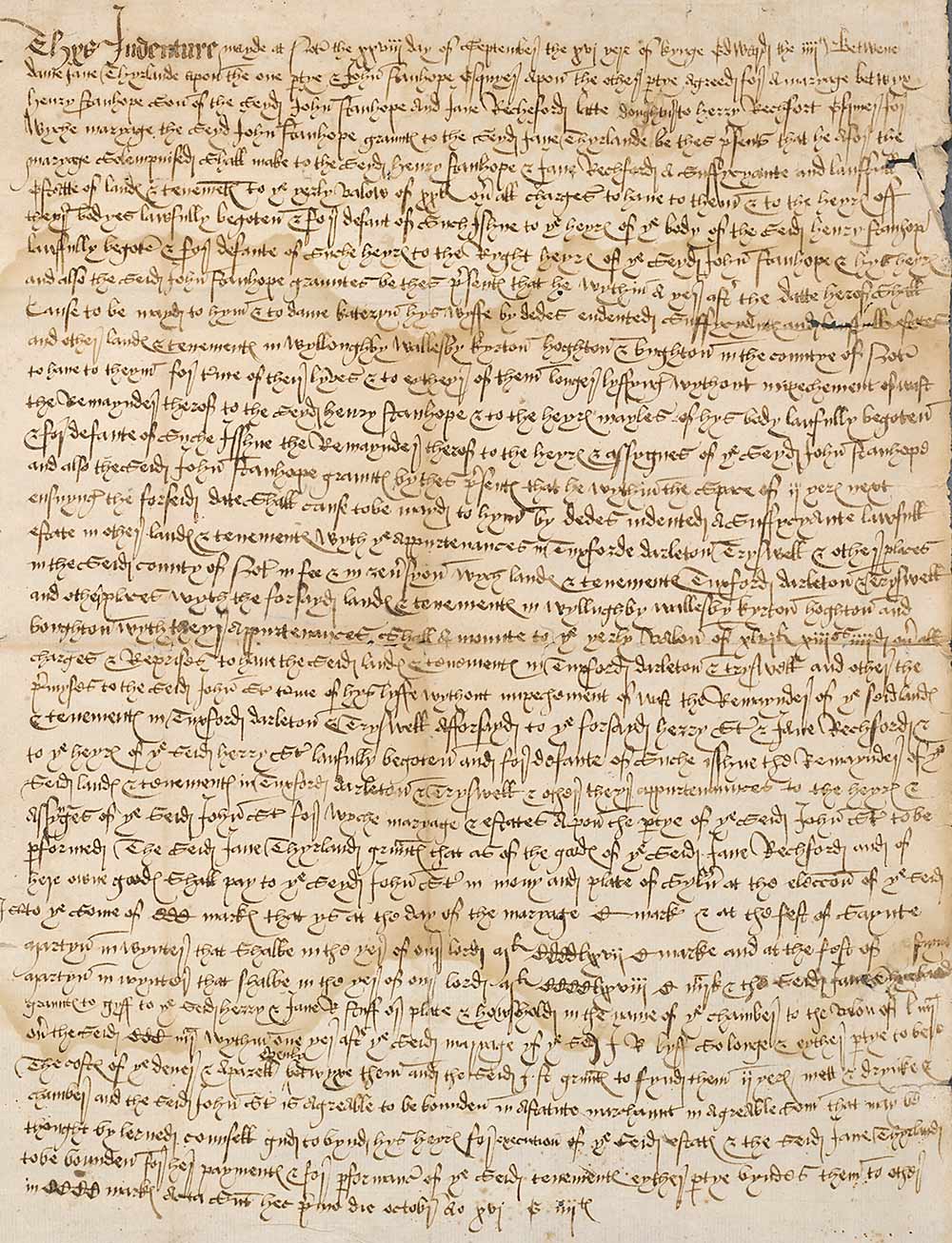 Thys Indenture mayde att Nottingham the xxviij day of September the xvj yere of kynge Edward the iiijth Betwene dame Jane Thyrlande apon the one partye and John Stanhope Esquyer apon the other partye agreed for a maryage betwyx Henry Stanhope Son of the seyd John Stanhope and Jane Recheford latte doughtur to Herry Rechfort Esquyer for wyche maryage the seyd John Stanhope grauntes to the seyd Jane Thyrlande be thes presents that he afor the maryage solempnised shall make to the seyd Henry Stanhope and Jane Rechford a suffycyante and lauffull Estatte of landes and tenementes to ye yerly valow of xx pounds ouer all charges to haue to them and to the heyres off theyr bodyes lawfully begoten and for defaut of such Ishue to ye heyres of ye body of the seid Henry Stanhop lawfully begoten and for defaute of suche heyres to the Ryght heyres of ye seyd John Stanhope and hys heyres and also the seid John Stanhope grauntes be thes presentes that he wythin a yer after the datte herof shall cause to be mayd to hym and to dame Kateryn hys wyffe by dedes endented suffycyant and lawfull estates and other landes and tenementes in Wylloughby Wallesby Kyrton Hoghton and Bughton in the countye of Nottingham to haue to theym for terme of their lyves and to eytheyr of them longer lyffyng wythout impechement of wast the Remaynder therof to the seyd Henry Stanhope and to the heyres mayles of hys body laufully begoten and for defaute of syche Isshue the Remaynder therof to the heyres and assygnes of ye seyd John Stanhope and also the seid John Stanhope grauntes by thes presentes that he wyll in the space of ij yeres next ensuyng the forseid date shall cause to be mayd to hym by dedes indented a suffycyante lawfull estate in other landes and tenementes wyth ye appurtenances in Tuxforde Darleton Tryswell and other places in the seid county of Nottingham in fee and in reuersyon wych landes and tenementes Tuxford Darleton and Tryswell and other places wyth the forsayd landes and tenementes in Wyllughby Wallesby Kyrton Hoghton and Boughton wyth theyr appurtenances shall amounte to ye yerly valou of xlvj pounds xiij shillings ouer all charges and Reprises to haue the seid landes and tenementes in Tuxford Darleton and Tryswell and other the premyses to the seid John Stanhope terme of hys lyffe wythout impechment of wast the Remaynder of ye seid landes and tenementes in Tuxford Darleton and Tryswell afforsayd to the foresayd Herry Stanhope and Jane Rechford and to ye heyres of ye seid Herry Stanhope lawfully begoten and for defaute of suche isshue the Remaynder of ye seid landes and tenementes in Tuxford Darleton and Tryswell and other theyr appurtenaunces to the heyres and assygnes of ye seid John Stanhope for wyche maryage and estates apon the partye of ye seid John Stanhope to be performed The seid Jane Thyrland grauntes that as of the goodes of ye seid Jane Rechford and of here owne goodes shall pay to the seyd John Stanhope in mony and plate of syluer at the eleccion of the seid J Stanhope to ye some of CCC markes that ys at the day of the maryage C markes and at the fest of Saynte Martyn in wynter that shalbe in the yer of our lord mille CCCClxxvij C marke and at the fest of saynt Martyn in wynter that shalbe in the yer of our lord mille CCCClxxviij C mark and the seid Jane Thyrland grauntes to gyff to ye seid Herry and Jane Rechford stuff or plate and howshold in the name of ye chamber to the valou of L marks ouer the seid CCC markes wythin one yer after ye seid maryage yf ye seid Jane Recford lyff so longe and eyther partye to bere The costes of ye dener and aparell evenly betwyxe them and the seid John Stanhope grauntes to fynd them ij yeres mett and drynke and chamber and the seid John Stanhope is agreable to be bounden in a statute marchaunt in agreable som that may be thought by lerned counsell gud to bynd hys heyres for execution of ye seid estates and the seid Jane Thyrland to be bounden for her paymentes and for performance of ye seid tenementes eyther partye byndes them to other in CCCC markes Acta Sunt hec primo die octobris Anno xvj Edward iiijth |