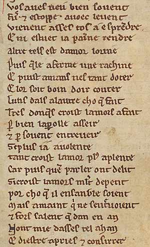 Vos aues ueu bien souent Fus et estoppe . auoec leuent Vienent asses tos a esprendre Que ni estuet ia painne rendre Altre tels est damor lorine Puis quele aferme une rachine Que puist amans nes tant doter Que lor soit boin doir couter Luns dals alautre cho que fait Tres donques croist lamors a fait Par bien laparolle asseir Et par souent entreueir Seplus i a auolente Tant croist lamor plus aplente Car puis quen parler ont delit Sicroist lamors moult depetit Por cho que il ensanble soient Mais amaint qui ne sentreuoient Et fors salent que dan en an Nont mie dasses tel ahan Que diestre apries et consirrer |
