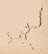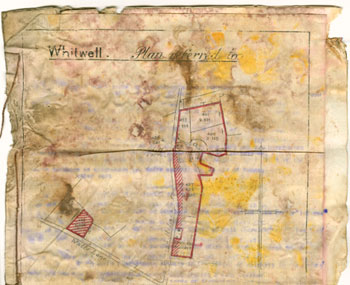 Detail from a mould-damaged linen plan, 1920 (Pl E12/6/26/44/2). The humidity has also caused the ink on a neighbouring document to bleed through