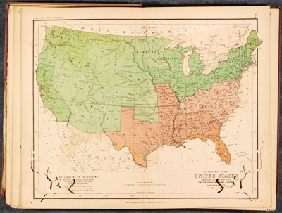 Bookworm damage evident in Henry D. Rogers, Atlas of the United States of North America... (London, c.1857), East Midlands Special Collection Oversize.X G1105 ROG