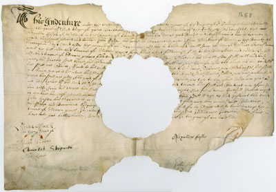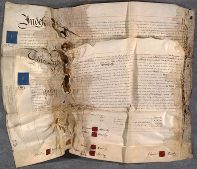 Damaged parchment deed, with parts of the membranes stuck together (Pl E12/6/20/21/7/1)