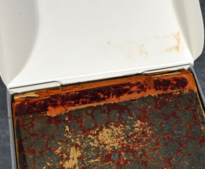 Leather-bound volumes are vulnerable to a chemical degradation process called ‘binding rot’, which causes the binding to crumble and decay to a fine red powder. The rot is inherent to the tanning process used to produce the leather, but the decay is greatly accelerated when the volumes are exposed to light. The photograph below shows a volume suffering from binding rot, which has been placed in a book box made to fit its dimensions, to keep it protected against further damage. Staining is visible on the interior of the box, where it has come into contact with the affected material.