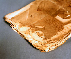 Single leaves of paper are placed in a tank of water in the leaf casting machine. New paper pulp of a similar nature to the original is added to the tank and drawn by suction through the damaged areas of the paper, before being left to dry. This is much quicker than repairing the damaged areas by hand. After strengthening the paper by adding ‘size’, the conservator cuts off any excess material, and packages the conserved documents in acid-free folders.