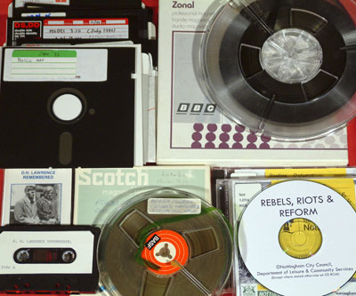 A selection of audio materials and electronic media including reel-to-reel and cassette tapes, CD, and floppy disks