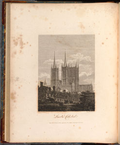 (right) Engraving of Lincoln Cathedral, from A Selection of Views in the County of Lincoln (London, 1805), East Midlands Special Collection Oversize Lin1.D28 HOW, showing signs of foxing. (left) reverse side showing bleed-through of ink from the engraving