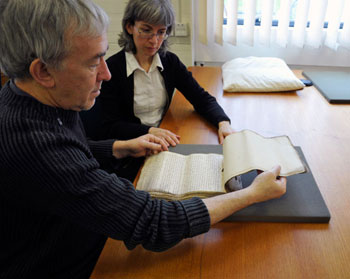 The pages of books can be made of parchment or paper. The binding of a book protects the pages from damage and keeps them in the right order, but if the binding is damaged, the inside parts of the book also become vulnerable. Some books are very tightly bound, especially when they have been re-bound. This makes it hard to see the whole page properly, and readers are tempted to force the book open too wide, damaging the spine.