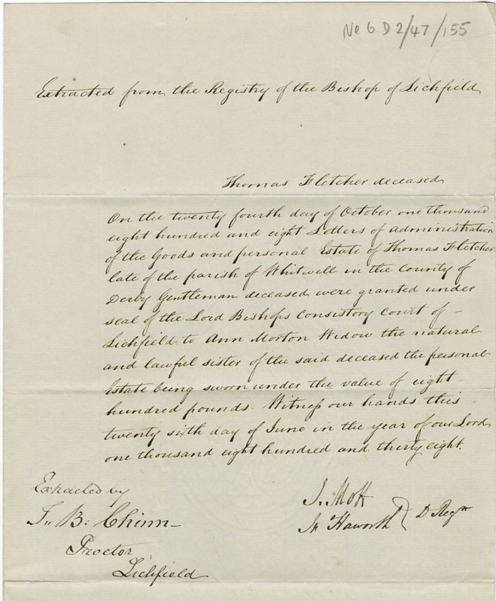 On the twenty fourth day of October one thousand eight hundred and eight Letters of Administration of the Goods and personal Estate of Thomas Fletcher late of the parish of Whitwell in the County of Derby Gentleman deceased were granted under seal of the Lord Bishops Consistory Court of Lichfield to Ann Morton Widow the natural and lawful sister of the said deceased the personal Estate being sworn under the value of eight hundred pounds. Witness our hands this twenty sixth day of June in the year of our Lord one thousand eight hundred and thirty eight.