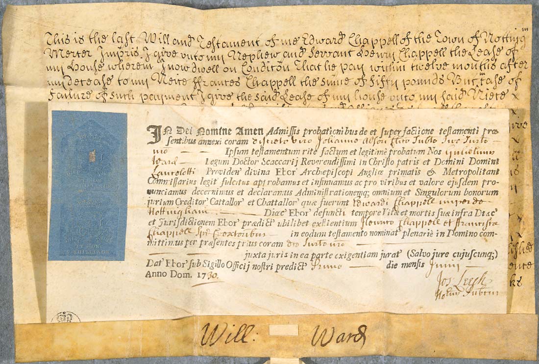 In the Name of God Amen: proofs of and upon the making of the testament annexed to these presents having been admitted before the Reverend John Abson, Clerk, our Substitute or Surrogate, we, William Ward, Doctor of Laws, lawfully supported Commissary of the Exchequer of the most Reverend Father and Lord in Christ, Lancelot, by divine providence Lord Archbishop of York, Primate of England and Metropolitan, do approve of and register the same testament, by custom made and legitimately proved, and do pronounce, decree and declare for the virtue and validity thereof, and we do fully in the Lord by these presents commit administration of all and singular the goods, rights, credits, cattle and chattels which belonged to [literally “were of”] Edward Chappell late of Nottingham in [literally “of”] the Diocese of York, deceased, being in his lifetime and at his death anywhere within the aforesaid diocese and jurisdiction of York, to Henry Chappell and Frances Chappell, spinster, co-executors named in the said testament, they having first before our said Surrogate sworn according to Law in that case required (saving any other person's right). Given at York under the seal of our aforesaid Office on the first day of the month of June in the Year of our Lord 1730.