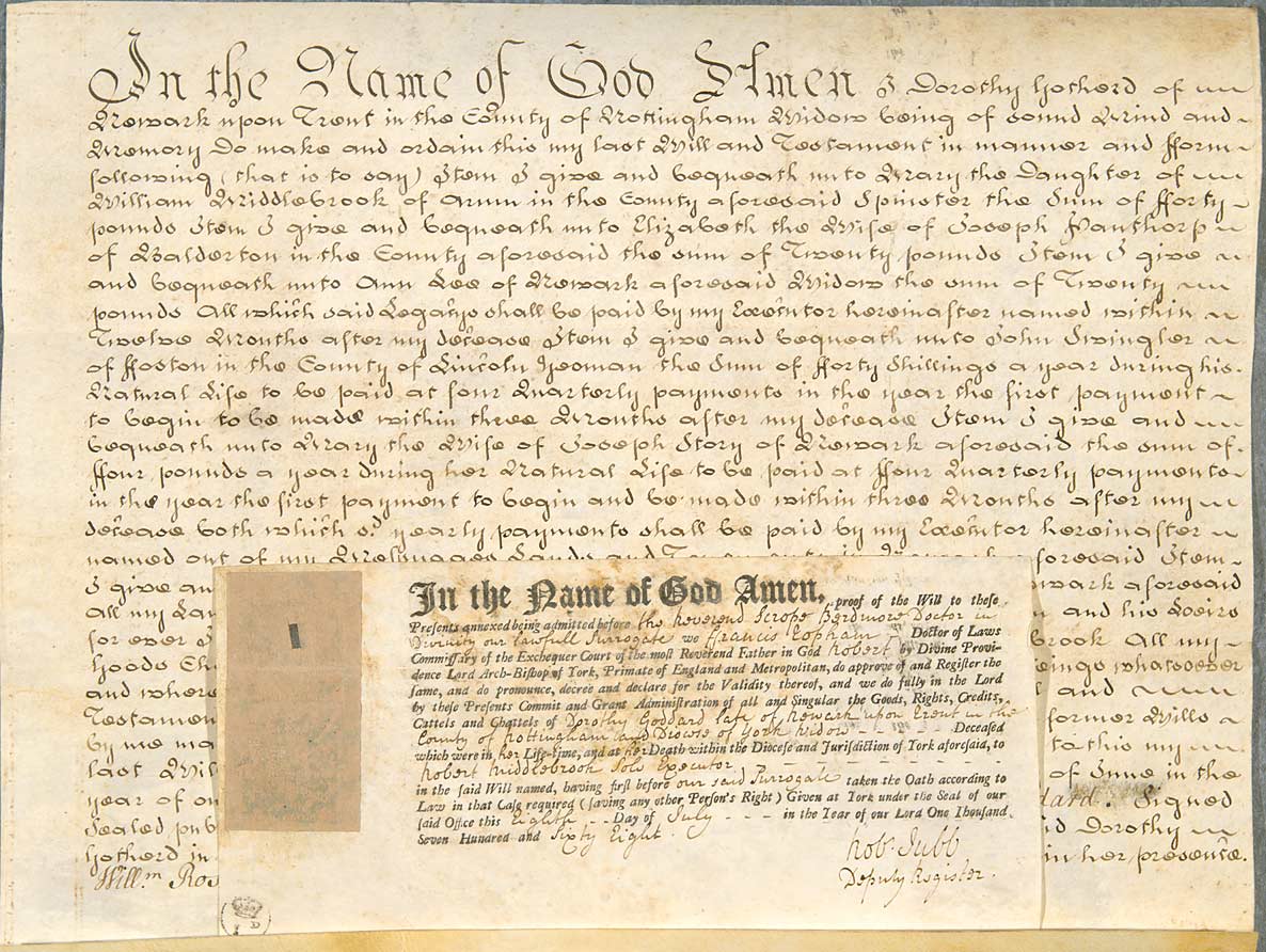 In the Name of God Amen I Dorothy Gotherd of Newark upon Trent in the County of Nottingham Widow being of sound Mind and Memory Do make and ordain this my last Will and Testament in manner and form following (that is to say) Item I give and bequeath unto Mary the Daughter of William Middlebrook of Arum [Averham] in the County aforesaid Spinster the Sum of Forty pounds Item I give and bequeath unto Elizabeth the Wife of Joseph Panthorp of Balderton in the County aforesaid the sum of Twenty pounds Item I give and bequeath unto Ann Lee of Newark aforesaid Widow the sum of Twenty pounds All which said Legacys shall be paid by my Executor hereinafter named within Twelve Months after my decease Item I give and bequeath unto John Swingler of Foston in the County of Lincoln yeoman the Sum of Forty Shillings a year during his Natural Life to be paid at four Quarterly payments in the year the first payment to begin to be made within three Months after my decease Item I give and bequeath unto Mary the wife of Joseph Story of Newark aforesaid the sum of Four pounds a year during her Natural Life to be paid at four Quarterly payments in the year the first payment to begin and be made within three Months after my decease both which s[ai]d yearly payments shall be paid by my Executor hereinafter named out of my Messuages Lands and Tenements in Newark aforesaid Item I give and bequeath unto my Nephew Robert Middlebrook of Newark aforesaid All my Lands and Tenements whatsoever in Newark aforesaid to him and his Heirs for ever I likewise given and bequeath unto the said Robert Middlebrook All my Goods Chattels Ready Money Bills Bonds Stock in Trade and Writeings whatsoever and wheresoever and do make him sole Executor of this my last Will and Testament he paying my Debts Legacys and Funeral Expences (revoking all former Wills by me made) In Witness whereof I the said Dorothy Gotherd have to this my last Will and Testament set my Hand and Seal the Thirtieth Day of June in the year of our Lord One Thousand Seven Hundred and Sixty two ~ Dor. Goddard. Signed Sealed published and declared to be the last Will and Testament of the said Dorothy Gotherd in the presence of us and witnessed by us at her request and in her presence. Willm Rose, Ann Sharp, Tho. Brown.