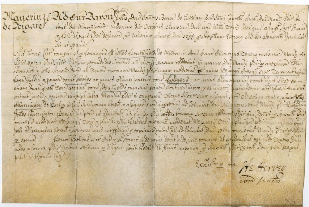 Ne D 5296 - Admittance, with recital of surrender (Latin) from John Heathfield to John Charrington of a half part of a messuage, barn, orchard and land in Leigh, Surrey; 11 Oct. 1699