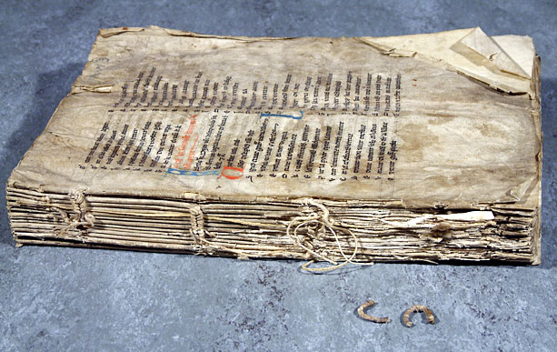 Cords threaded inside wooden board, prayer book WLC/LM/11 before conservation