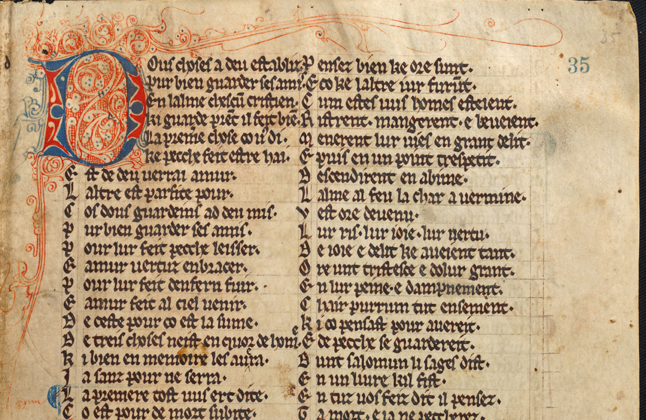 The example below is from an early thirteenth-century French book. The book is decorated with large pen-flourished initials to signal text divisions. The initials are eight lines in height, with party-coloured bars in red and blue. These kind of decorated initials are called 'lombards', and were commonly used in late medieval (post-1200) manuscripts. There is considerable variety in the detail within these examples and in the degree to which they are associated with marginal flourishes.