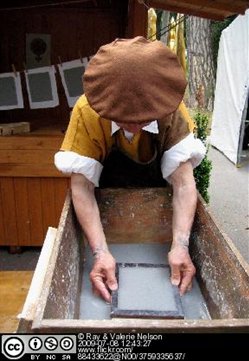 Paper is a manufactured material. Compared to parchment, it is easier to make to a regular size in appropriate quantities. It can also be made consistently smooth across a sheet. Until the eighteenth century most paper was made with textiles, by recycling cloth, rags and similar fibres, which were mashed and soaked down to a pulp. Then the pulp was spread in a mould, a wooden frame with wires up and down it. The watermark shape, also made of wire, would be fixed into the mould. The mould would be squeezed to extract the water from the paper, and in so doing, the chain lines and the watermark would leave an impression on the paper. Experts can use watermark evidence to identify paper manufacturers and estimate the date a particular sheet of paper was produced.