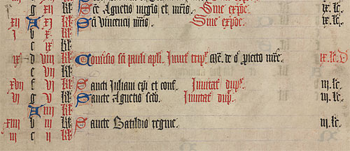 In the thirteenth century scribes began to use a form of Cursiva Anglicana. The hand is rounder and more fluid, but still employs tall ascenders, some of which ('H' and 'L') have hooks at the top. The capital letters are embellished with double lines.