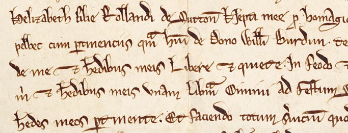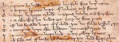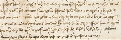 This marriage agreement includes some elements which would be seen in later Secretary hands, but the writing seems to be a personal, rather hybrid style. For instance, the scribe sometimes writes 'the', but sometimes uses the old Anglo-Saxon letter thorn, 'þe'.