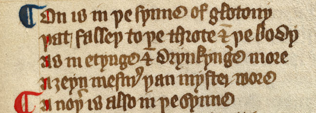 This fragment from the South English Legendary, written in the early fourteenth century, is in Anglicana. One of the most striking differences from Textura is how many letters extend above or below the writing line. For instance, a long-tailed 'r' with the descender reaching below the line of writing (as seen in the second word, 'seruant'), and a long 's' which also extends below the writing line (as seen in the word 'ssame' at the end of the second line. At this date, this script is also characterised by hooks and flourishes.