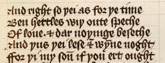 The next example is a very clear script from the mid-fifteenth century, by the professional scribe 'Froddesham'. In comparison with the previous example, the letters are very tightly formed. This hand owes something to Textura scripts, especially in the way some of the letters such as 'd', 'o' and 's' are written using a diamond, rather than a round, shape.