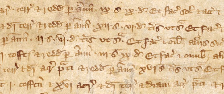 Below is an early fourteenth-century example of an administrative record. The cursive style of writing, and the very extensive use of abbreviations, allowed the scribe to write fast.