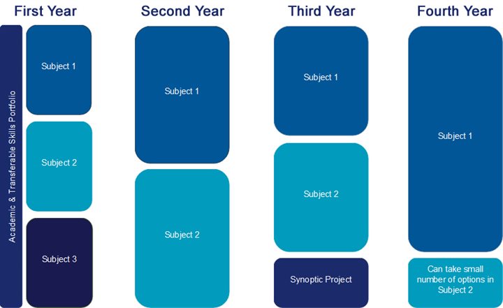If you choose an MSci, year four tends to focus mainly on a single subject because half of your year is a research project. This can be in a single discipline or be interdisciplinary. Alongside this you choose optional modules in one or both of your third year subjects.