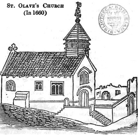 St Olave’s Church, Chester drawing from Holme in 1660 with tower in the syle of a Norwegian “Stave Church”.