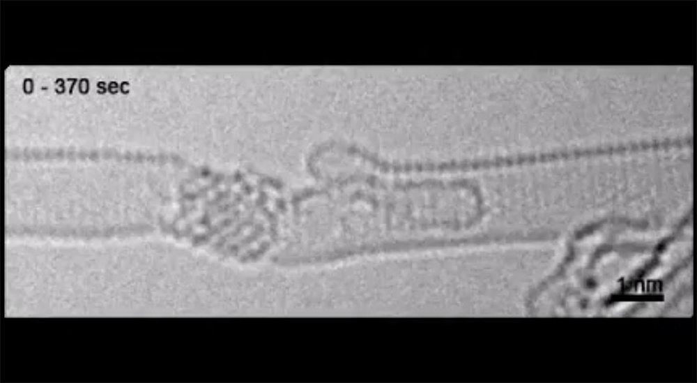 The scientists, led by the University of Nottingham School of Chemistry’s Professor Andrei Khlobystov and Professor Ute Kaiser, head of the Electron Microscopy of Materials Science in the University of Ulm, have used carbon nanotubes – atomically thin hollow cylinders of carbon just 1-2 nanometers wide – as miniature test tubes for atoms and molecules to record moving images at the atomic scale using transmission electron microscopy (TEM).