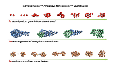 Intriguingly, each metal displayed a different example of how the initially amorphous atomic clusters could overcome the size requirement and energy barrier for nucleation:
