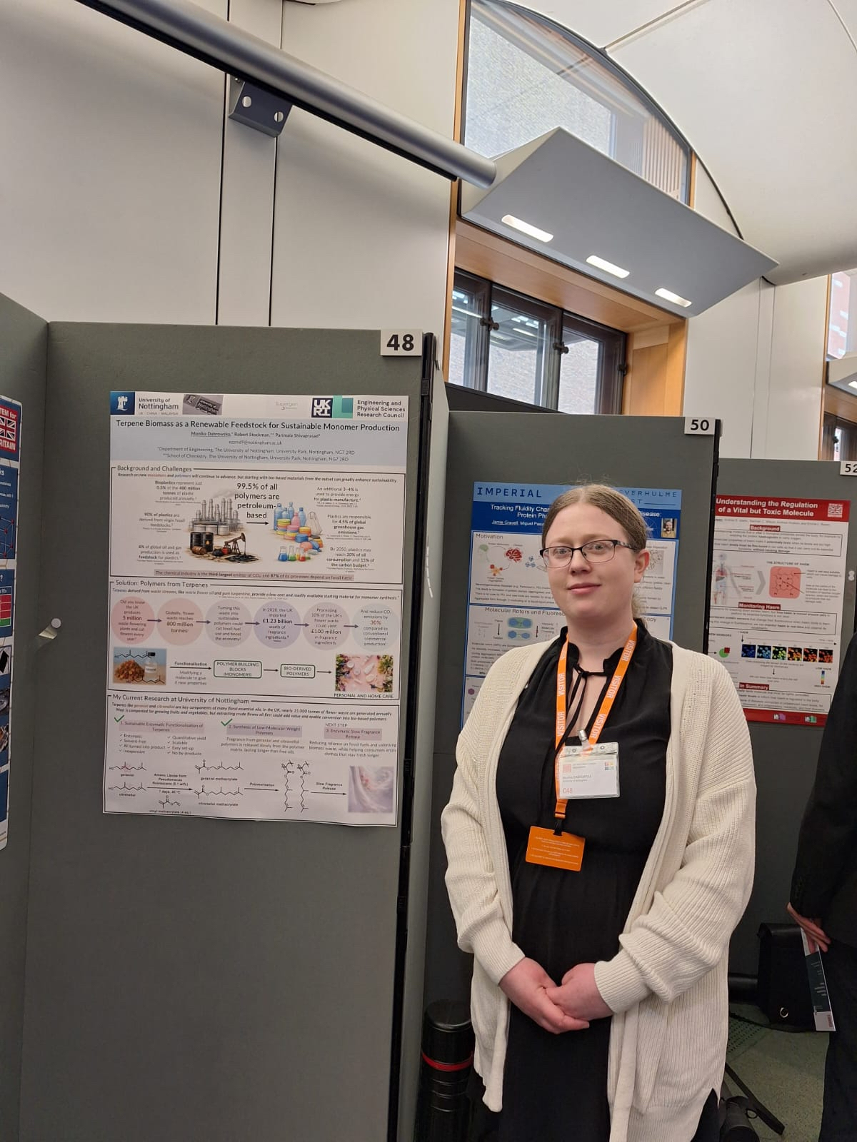 Monika is an EPSRC Doctoral Prize Research Fellow who explores the use of renewable terpene feedstocks to develop novel bio-based polymers. By using chemo-enzymatic approaches to transform compounds from flower waste and turpentine into functional monomers, her research enables sustainable alternatives to petroleum-derived materials. These materials have applications in advanced manufacturing, including 3D printing, as well as in personal and home care products, supporting greener chemical innovation.