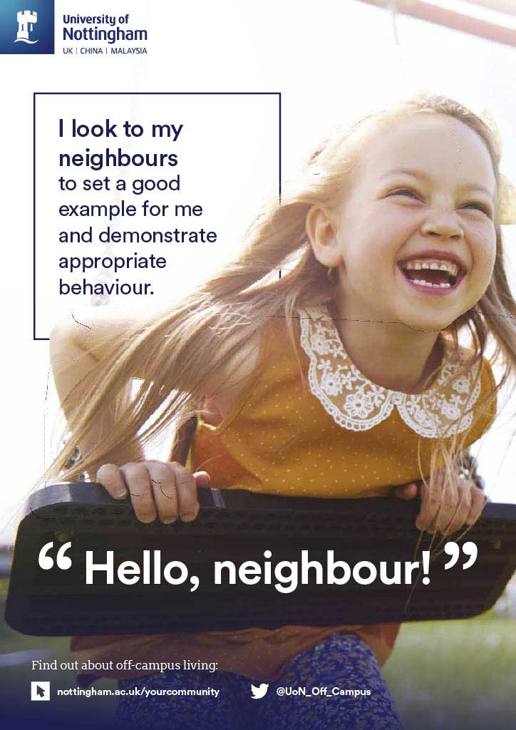 - the Hello Neighbour campaign which will see posters being put up around campus and supplied to local residents to display in their windows