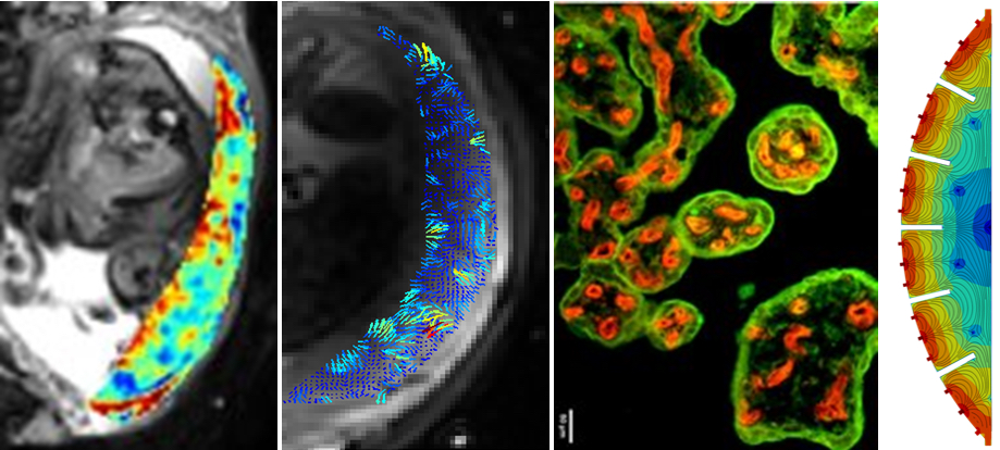 MRI of whole placenta showing maternal blood oxygenation & flow, image of placental villous trees which contain the baby’s blood and mathematical modelling of venous return.