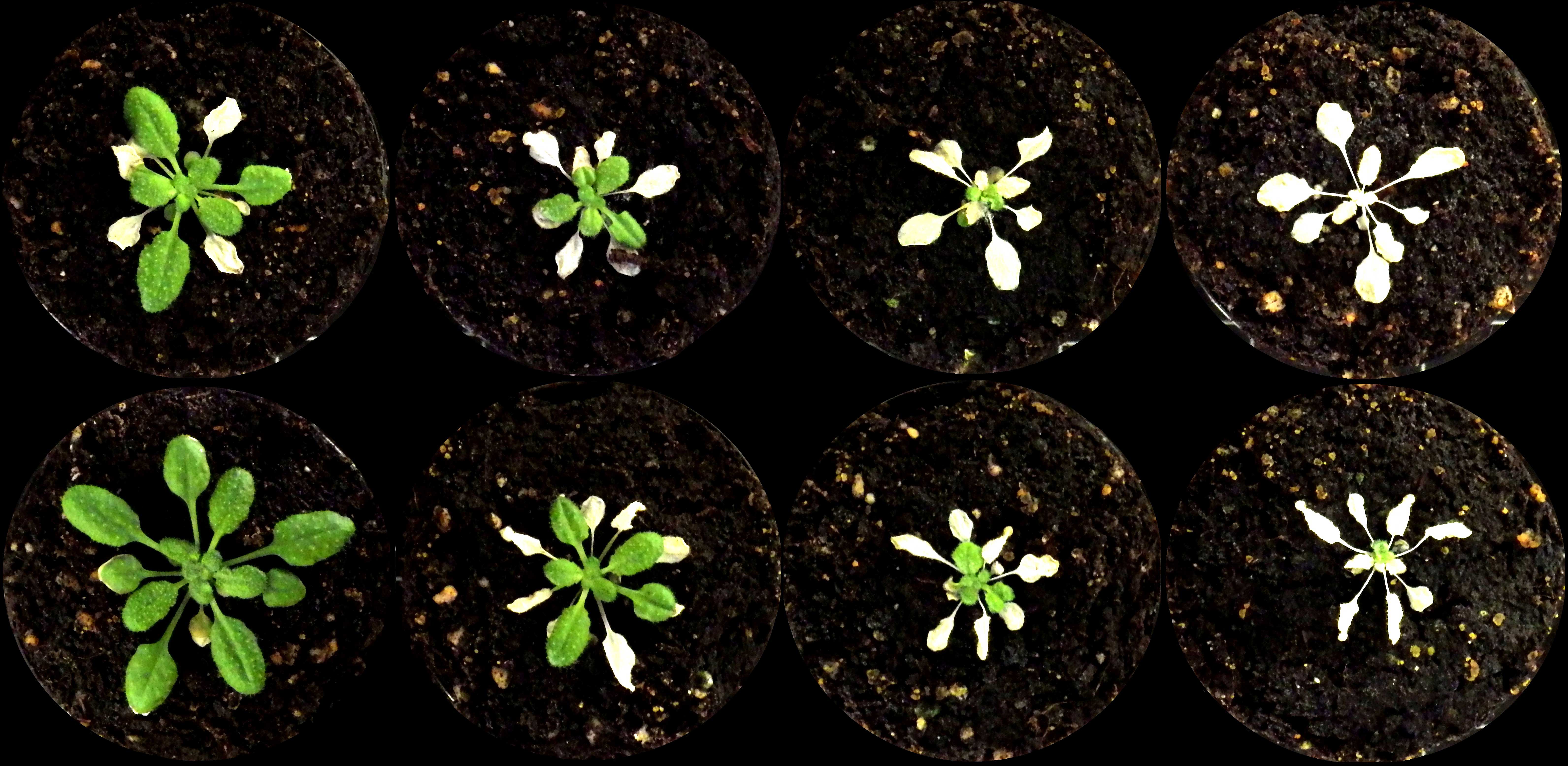 The plant species Thale cress, Arabidopsis thaliana after being exposed to low oxygen conditions. The lower row of plants received an ethylene pre-treatment, triggering the ‘hypoxia anticipatory mechanism’ that causes them to go into survival mode faster. These plants therefore visibly survive oxygen deficiency better than the untreated plants in the top row.
