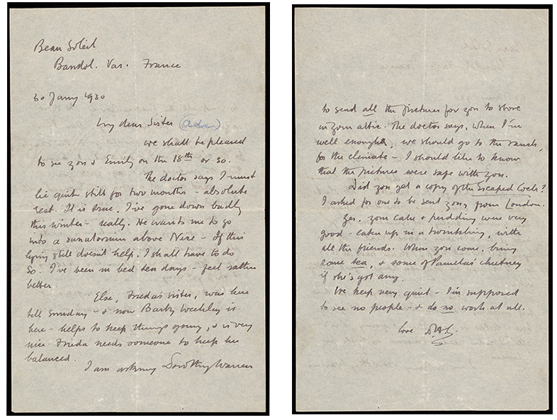 The archive will include some of the university’s recent acquisitions which were not previously in the public domain. One of them is a letter to his sister Ada, written in the south of France shortly before his death from TB in March 1930. He wrote: ‘The doctor says I must lie quite still for two months - absolute rest. It is true, I’ve gone down badly this winter - really. He wants me to go into a sanatorium above Nice - If this lying still doesn’t help, I shall have to do so. I’ve been in bed ten days - feel rather better.’ Both this acquisition and ‘Dregs’ were generously supported by funding from Arts Council England /Victoria and Albert Museum Purchase grant fund and the Friends of the National Libraries.