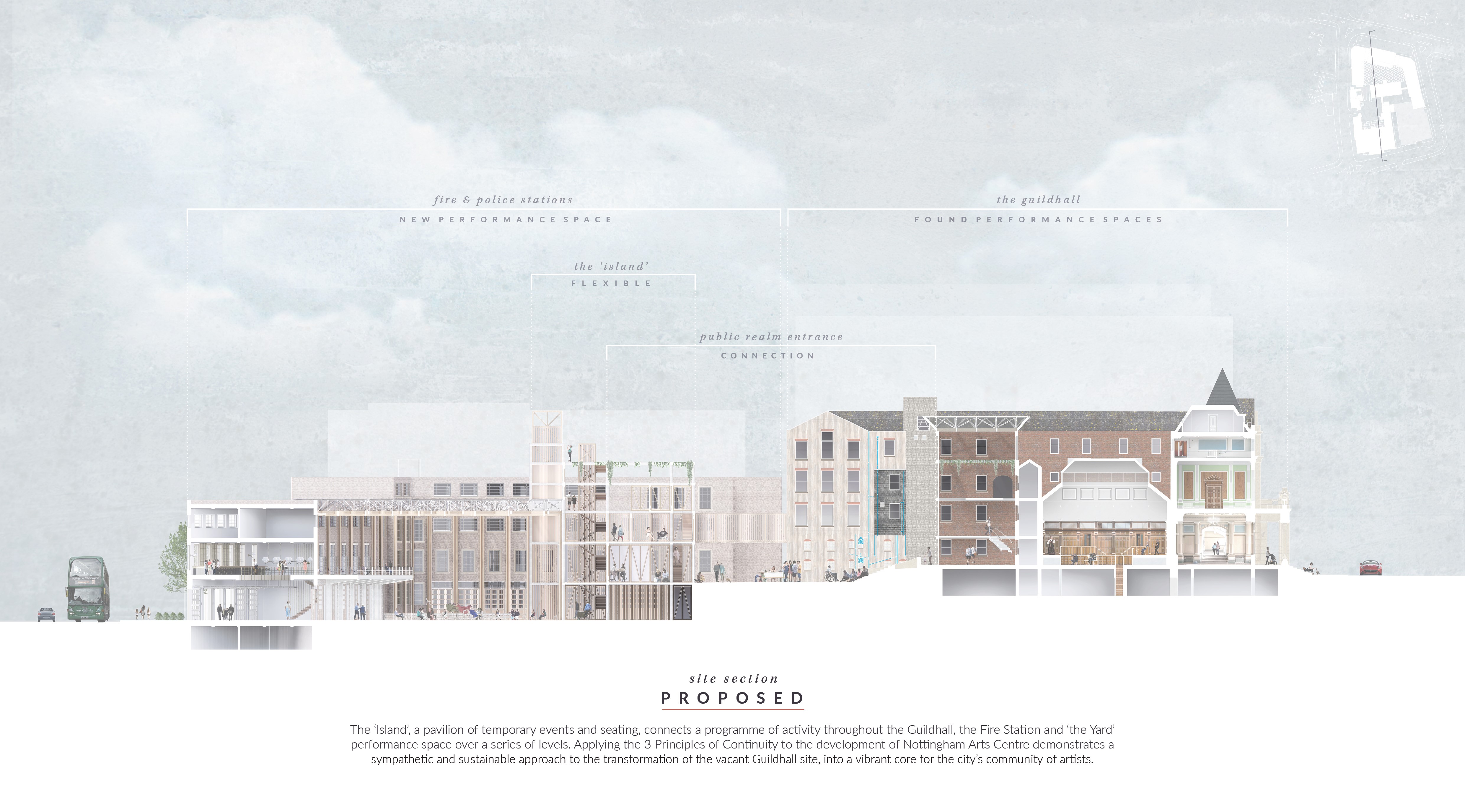 Jess, 24, chose three sites in Nottingham city centre - all with distinct characters and in various conditions - and reimagined them as a community arts centre. The scheme looked at the Grade-II listed 1888-built Nottingham Guildhall; the Art-Deco inspired fire station; and the 1954 ‘island’ building that extends the Guildhall. Jess visualised them as a cultural hub for local communities to enjoy while celebrating the existing architecture and history of the site.