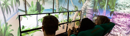 Fraunhofer Institute for Industrial Engineering (FhG-IAO) in Stuttgart. This is a mock-up of an aircraft cabin with seats in a row and 3D displays on the cabin walls, seats in front and even on the floor. Dr. Matthias Bues, Head of the Competence Team Visual Technologies at FhG-IAO, says: “Computer generated virtual environments can be projected on the displays giving the illusion of an invisible plane. You feel that you are flying through vistas of a tropical island or city-scapes. In our “super-here” scenario the features of the plane journey are enhanced so that you can enjoy the experience of flying. In our “super-there” scenario we can take you out of the plane to another more relaxing environment. If you had any fear of flying, this may help you on your journey.”