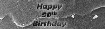 The message saying ‘Happy 90th birthday Your Majesty’ has been etched by Dr Michael Fay from the Faculty of Engineering and Dr Christopher Parmenter from the School of Pharmacy using a Focused Ion Beam Scanning Electron Microscope (FIB-SEM). The machine is capable of etching and manipulating materials with nanoscale precision by a focused beam of Gallium (Ga) ions while imaging the structure by a beam of electrons.