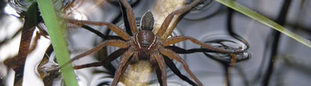 The Fen Raft spider (Dolomedes plantarius) lives by freshwater and is one of the UK’s rarest native species. Adult spiders can grow to a length of 7cm, including their legs, and they are typically brown or black, with yellow or white stripes along the sides of their body. They are capable of hunting and hiding underwater on stems of plants.